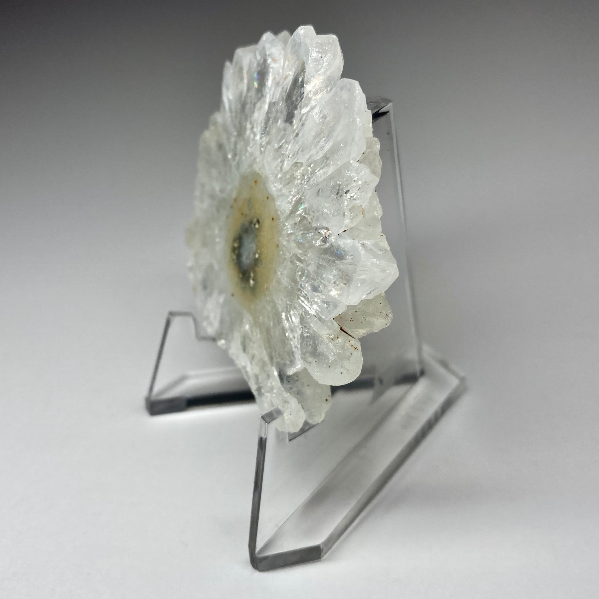 The middle core is made of agate with beautiful clear quartz crystals fanning out from the center. Unlike other limestone and calcite stalactites that form in caves, these stalactites are made within quartz cavities in a hydrothermal igneous formation. The multicolored agate center is formed when the chemicals and minerals in the water change as it runs through the cavity. The crystals then grow around the agate.
