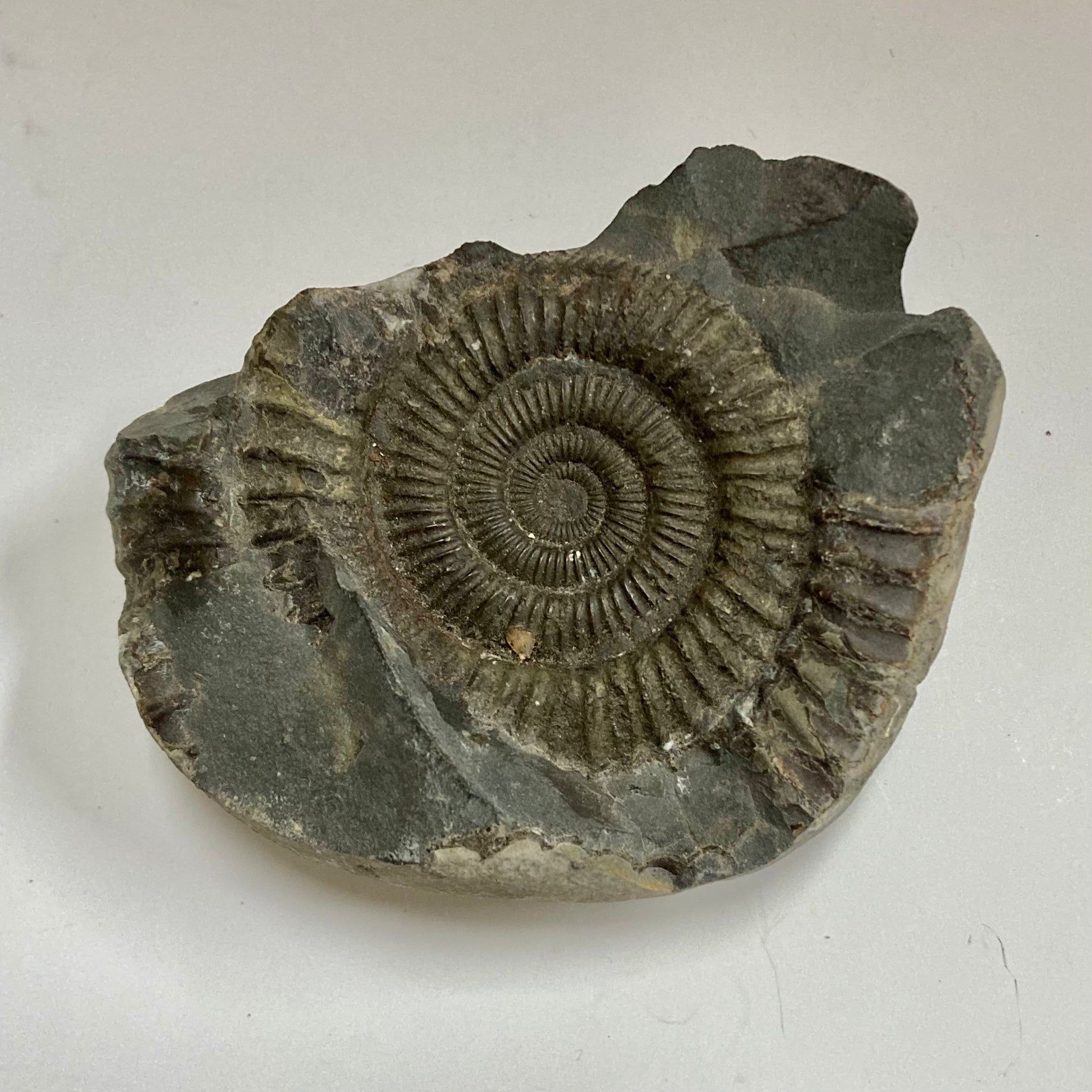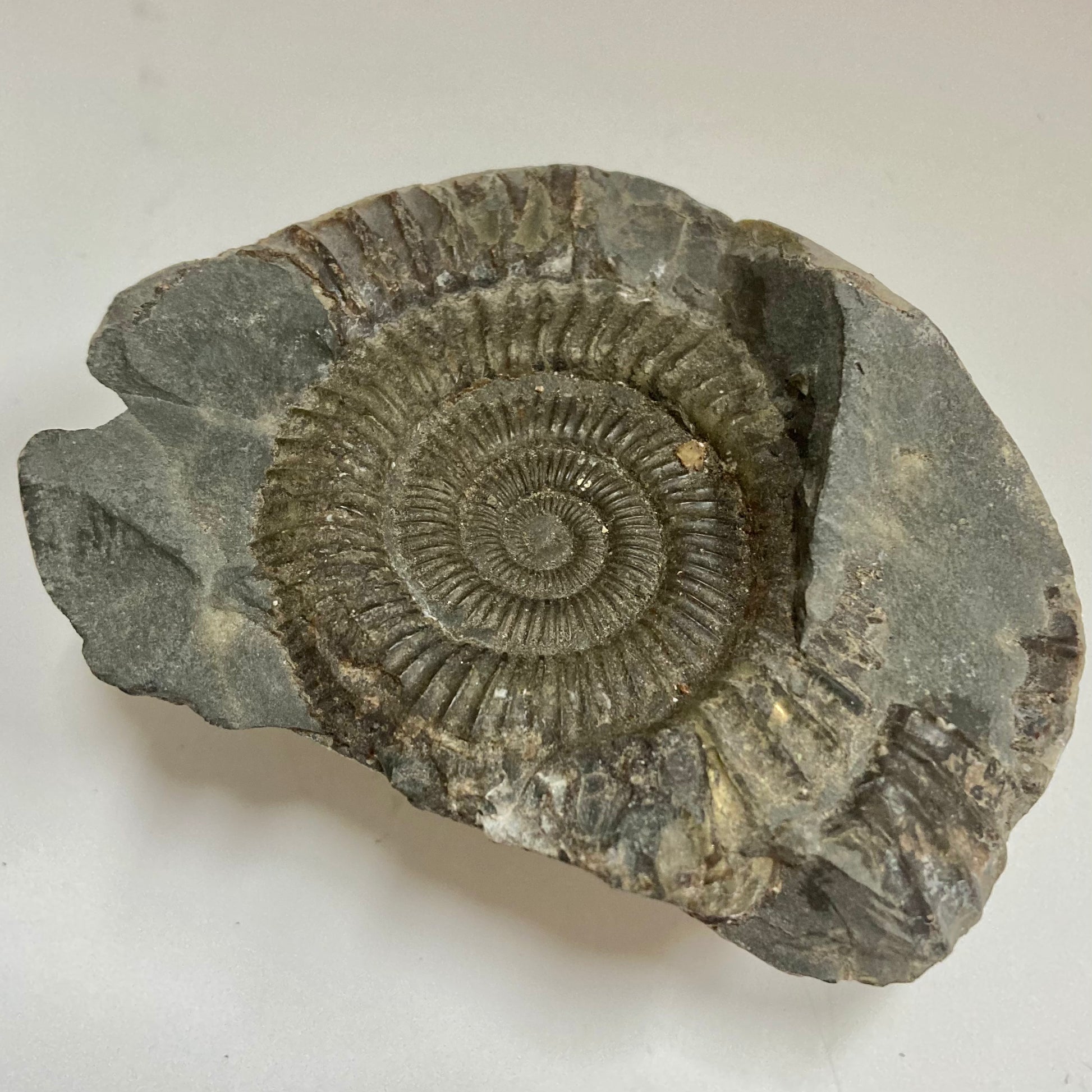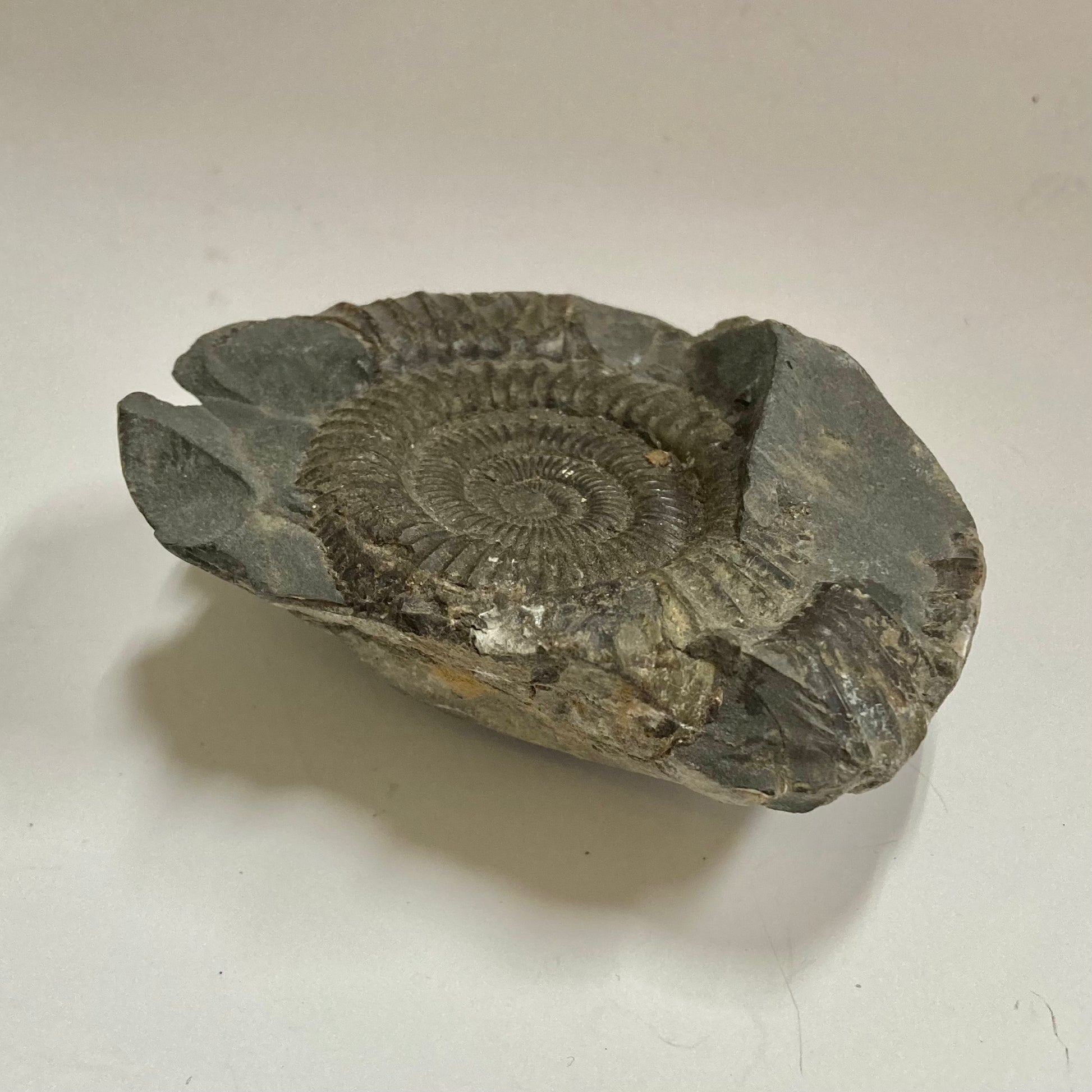 This ammonite is named after the Greek word dactyl meaning "fingers" because of the many straight ribs on its relatively small but strong shell. Mass mortality specimens are found all over the world, especially in Europe, indicating Dactylioceras may have died shortly after traveling to a specific area for spawning, allowing their shells to wash up in large quantities on the banks of the Jurassic seas.
