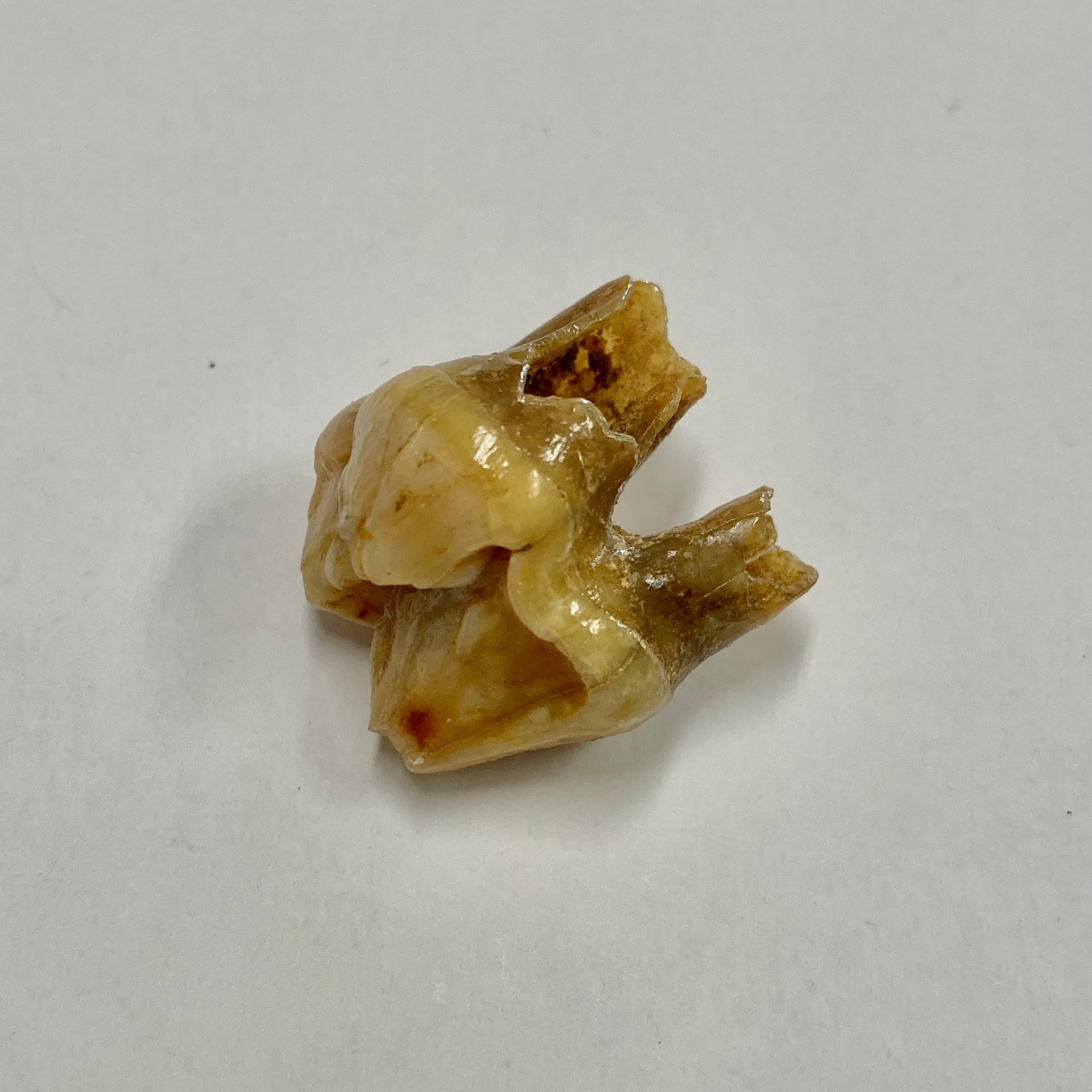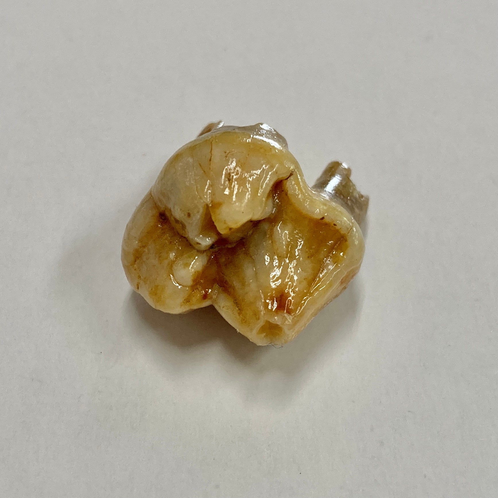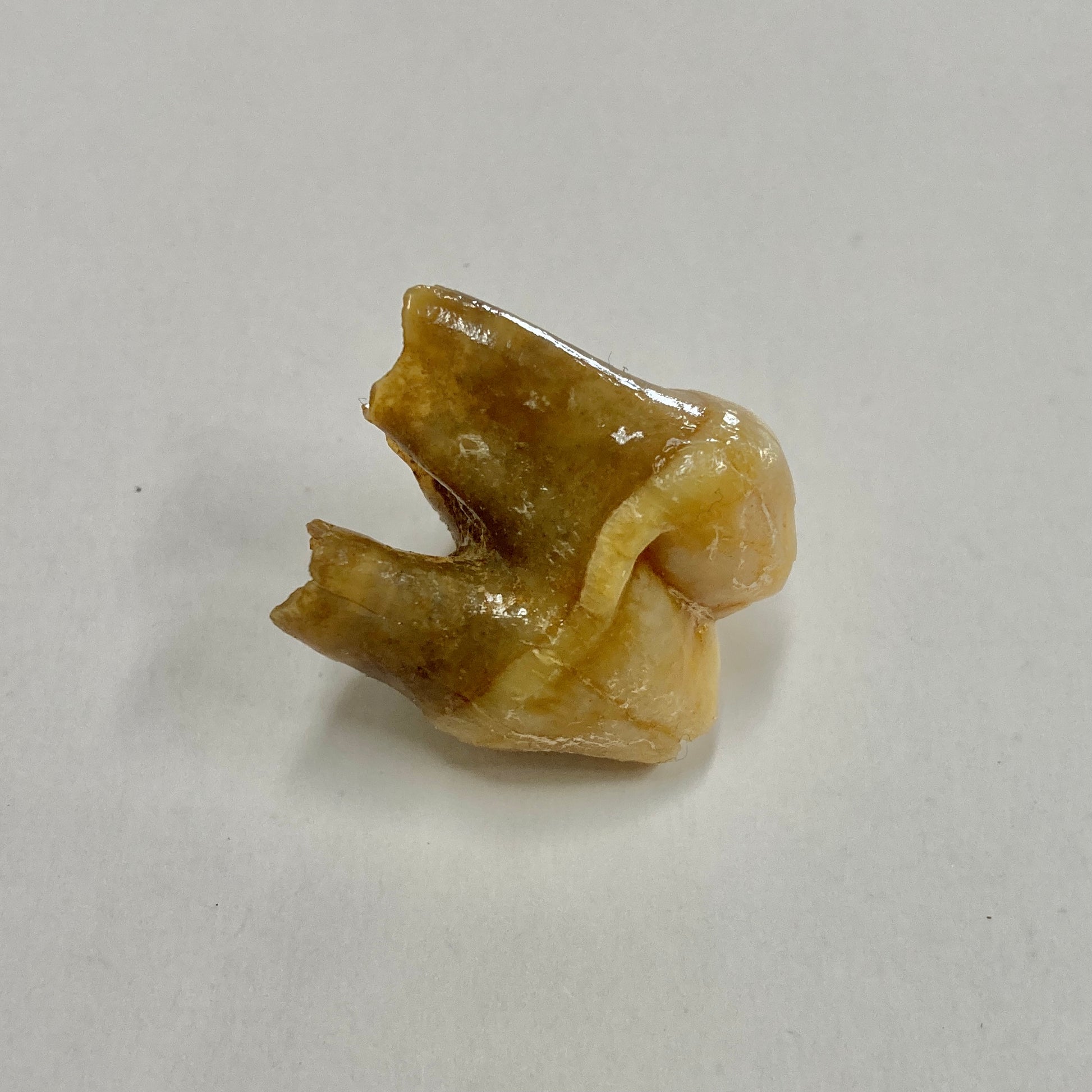 This premolar is from a cave bear that lived in Europe during the Pleistocene. The shiny tooth enamel has been well preserved with remnants of soil in the grooves. The roots are incomplete, but this fossil is a great insight to the diet and habits of the cave bear.