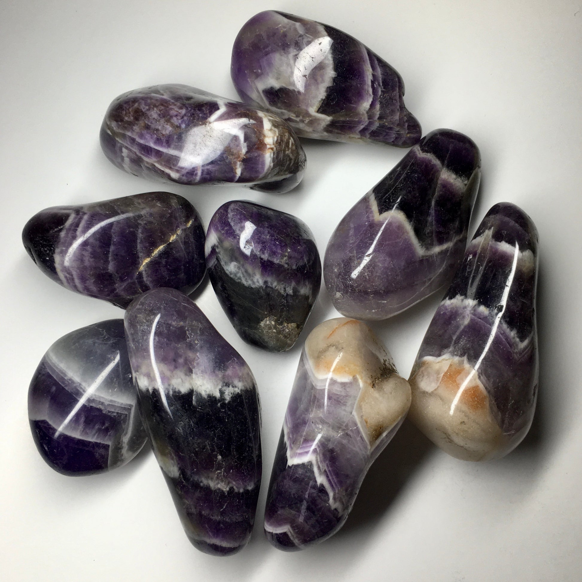 Chevron Amethyst, or Dogtooth Amethyst, is a combination of white quartz and amethyst banded together to form a V-shaped pattern. This stone is smoothly rounded and polished.