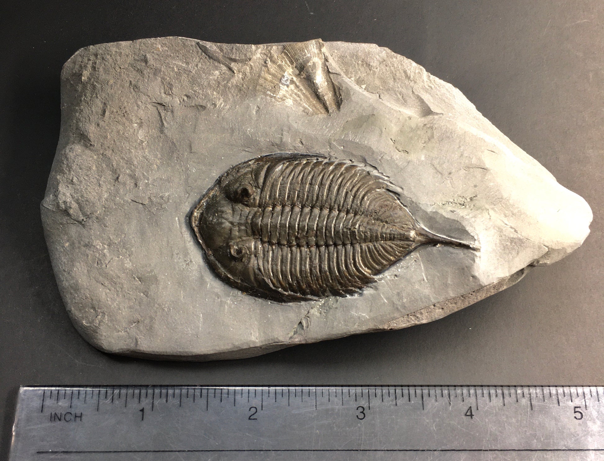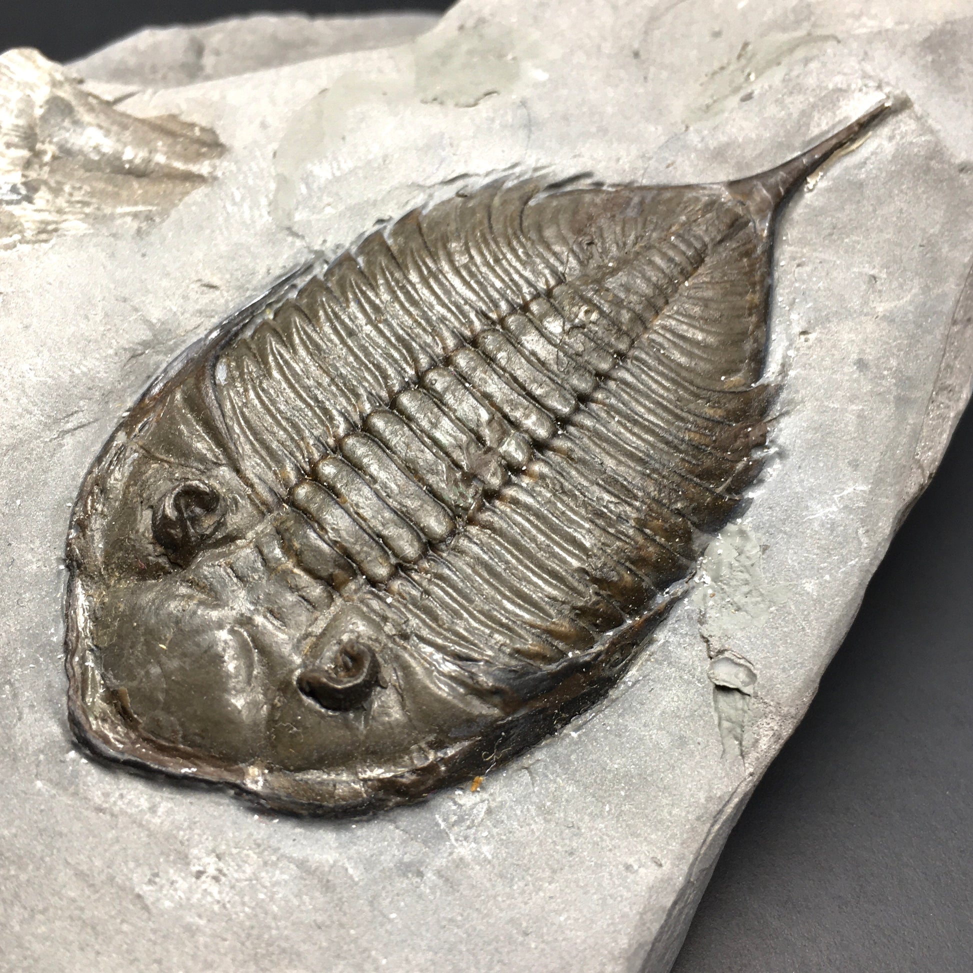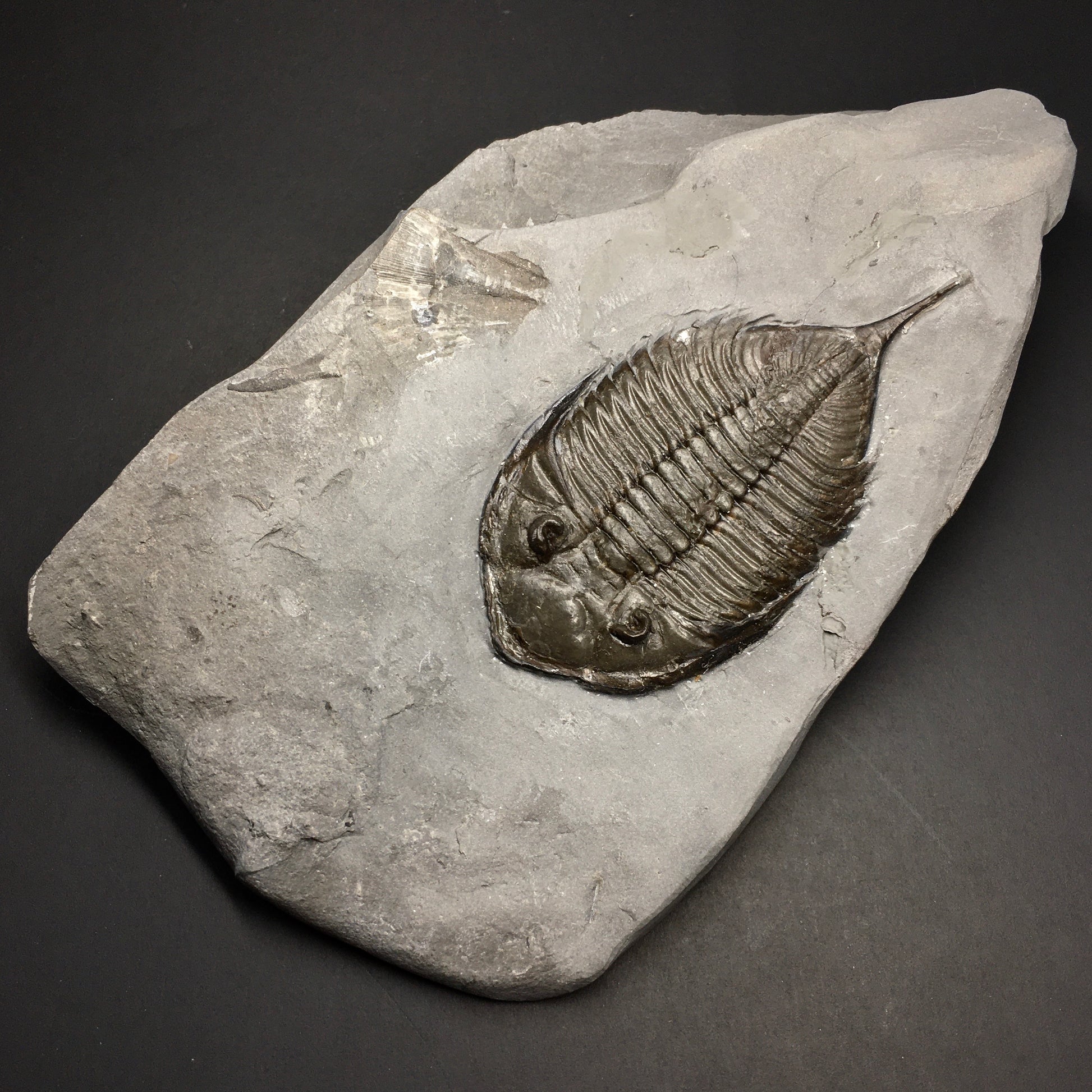 The Dalmanites trilobite lived in the ocean during the Silurian period between 450 - 415 million years ago, yet resembles the modern horseshoe crab. This particular specimen clearly shows the eye facets and armor that kept it protected. The dark gray color of the specimen stands out clearly from the shale, making this an ideal addition to your collection of trilobites!
