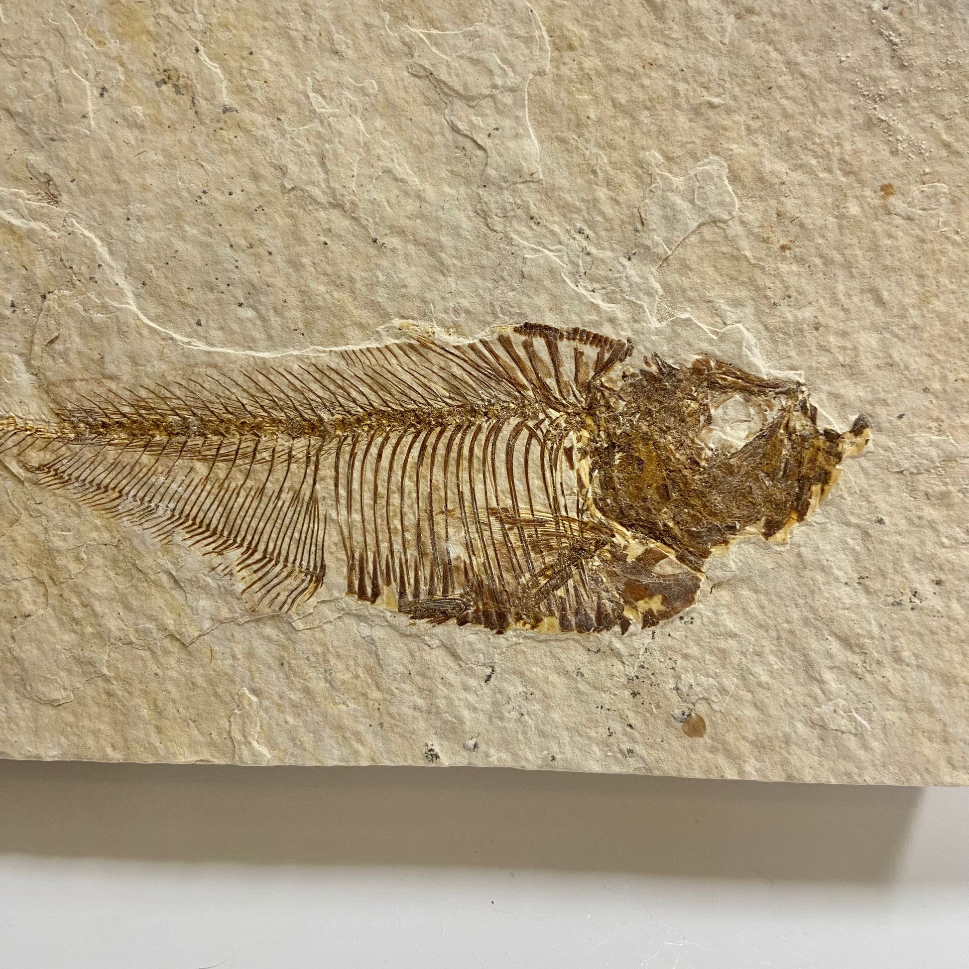 About 50 million years ago this fish swam in a fresh water lake located in Southwestern Wyoming. When the fish died it sank to the bottom of the lake where it was quickly buried. The soft sediments encased the fish and, over time as the rock hardened, the skeleton was preserved. This specimen was recently excavated from the hillside and additional careful work has resulted in capturing a piece of Wyoming's geological past.