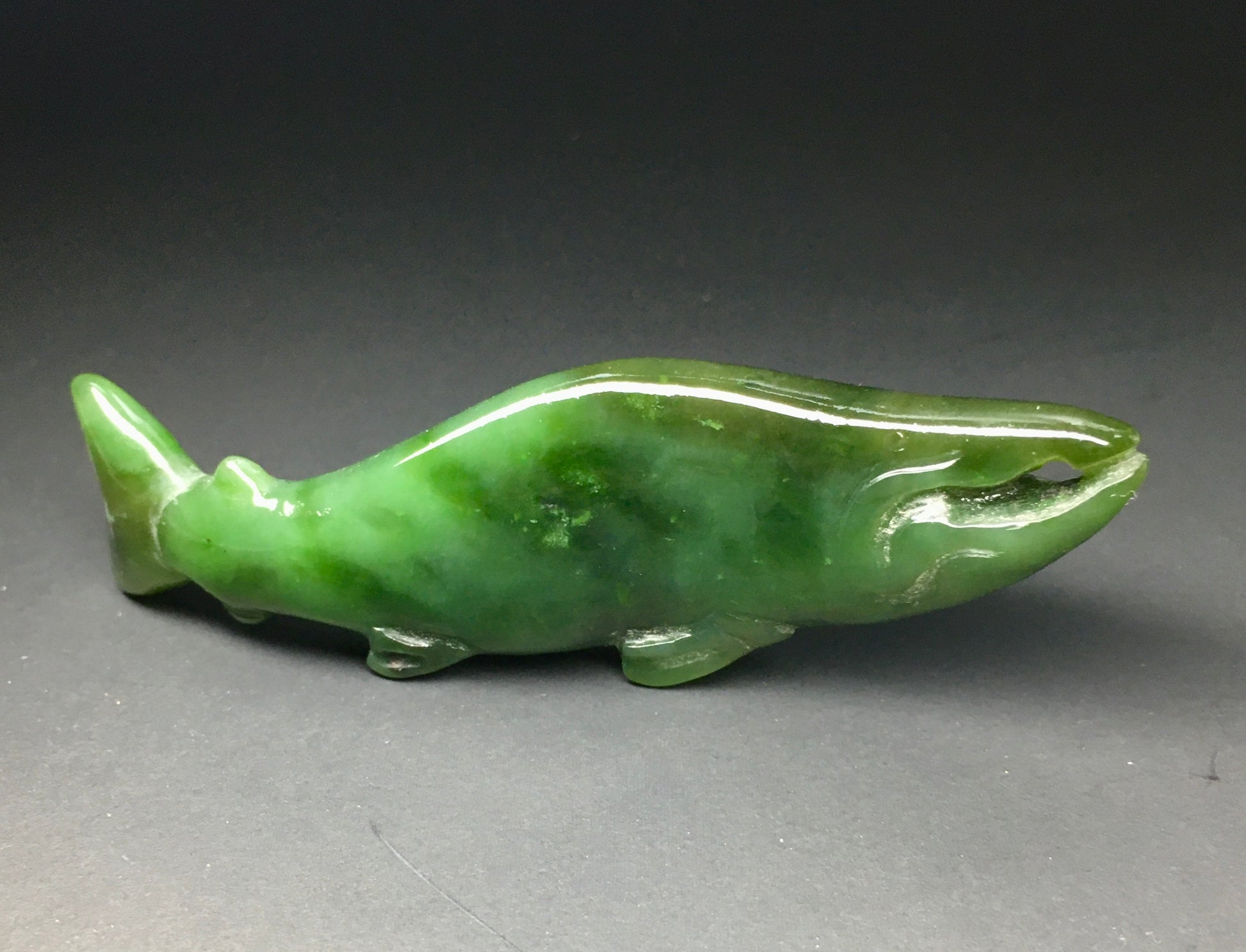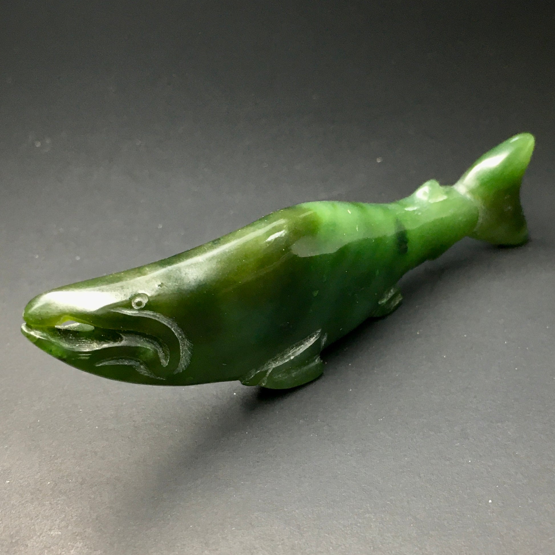 This stunning, hand-carved jade salmon glimmers green as he swims across your table!