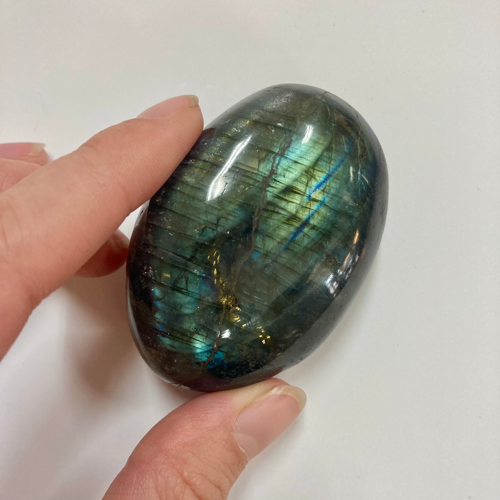 Watch as this palm stone labradorite mystically transforms from a dull greenish-brown to glowing blues, yellows and greens.