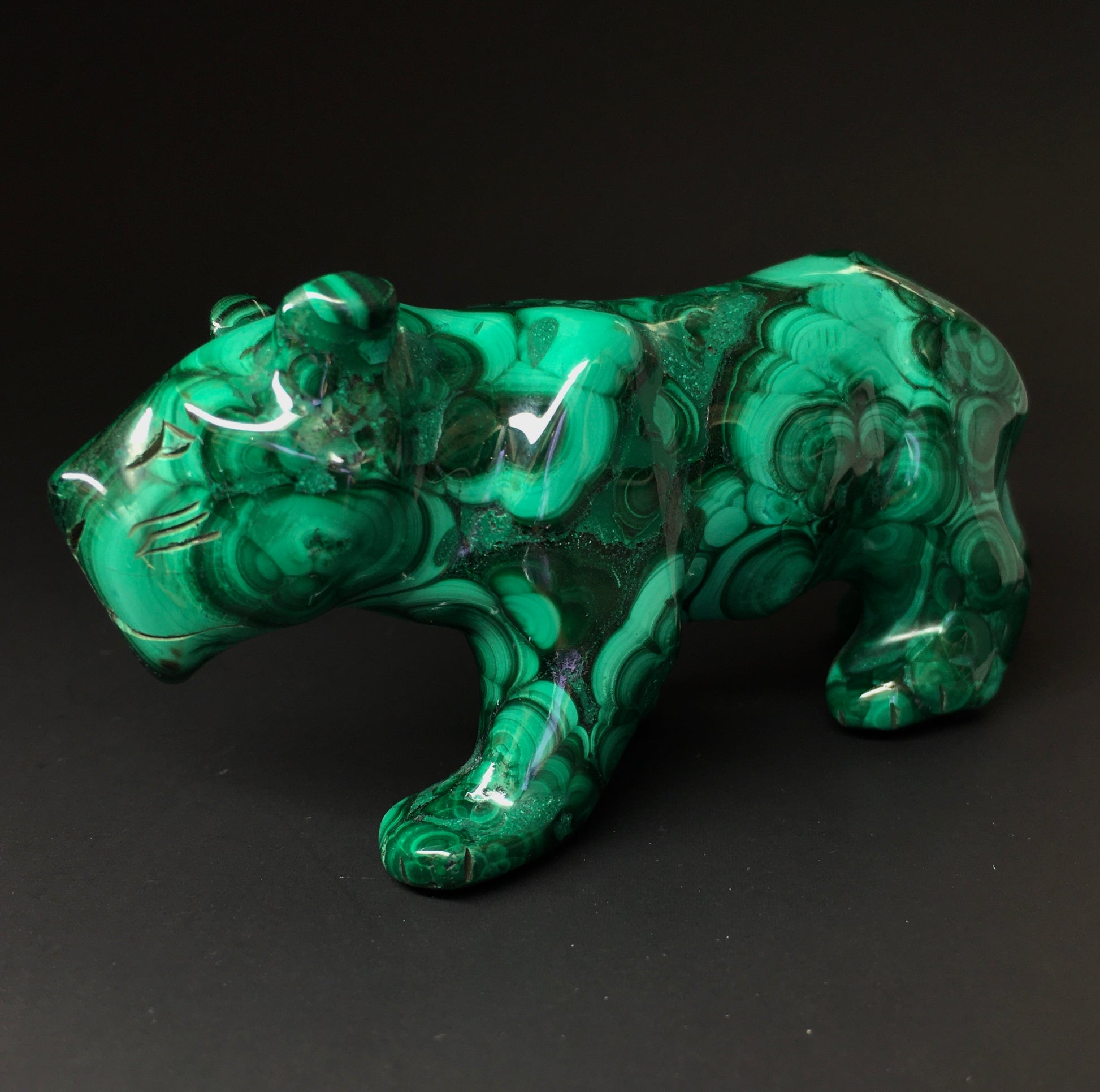Your friends will roar with jealousy when they see this majestic lion! This feline is hand-carved and polished from a beautiful piece of malachite.