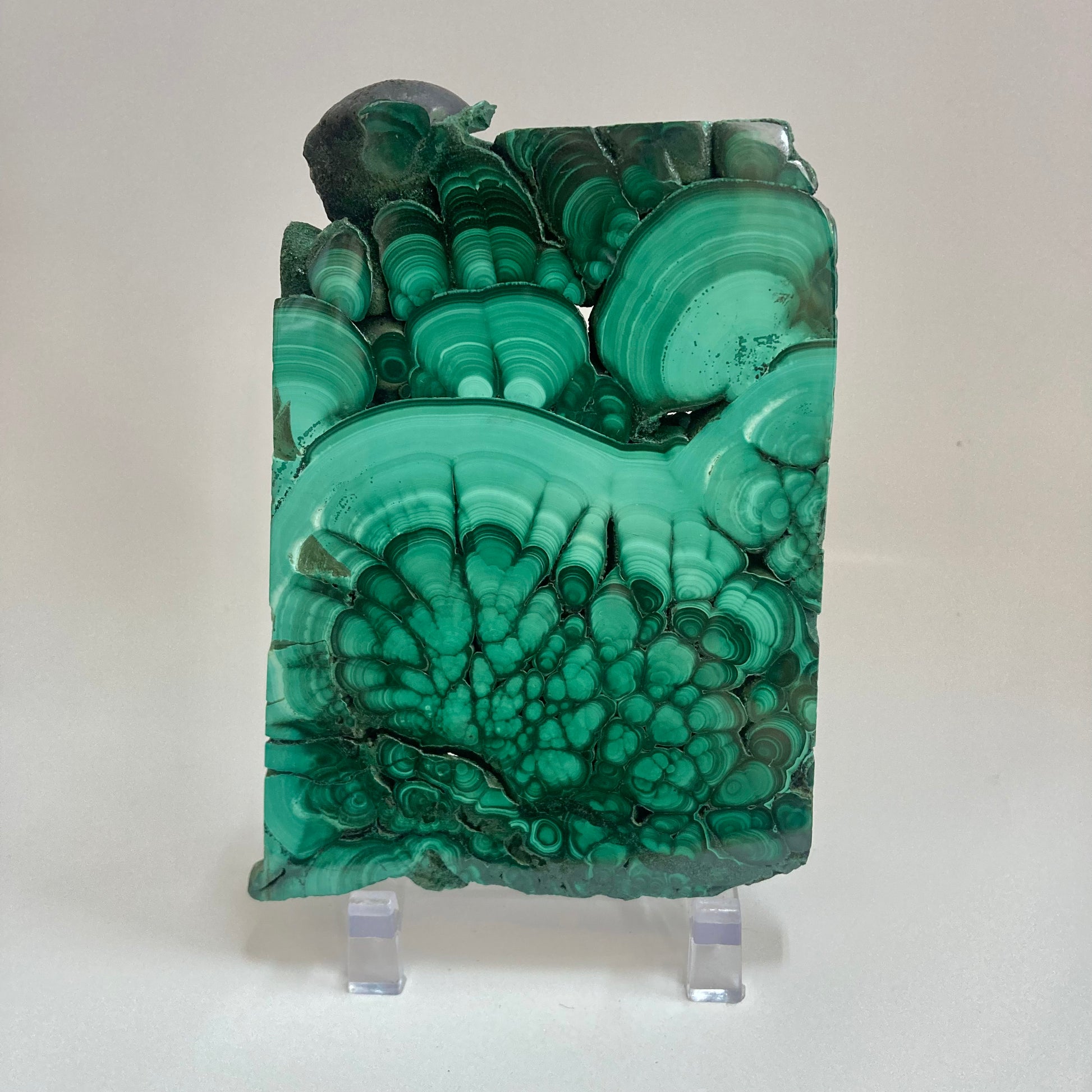 Malachite is a secondary copper mineral that is known for its green color. When it is cut, the surfaces display banding and eyes that resemble agates.