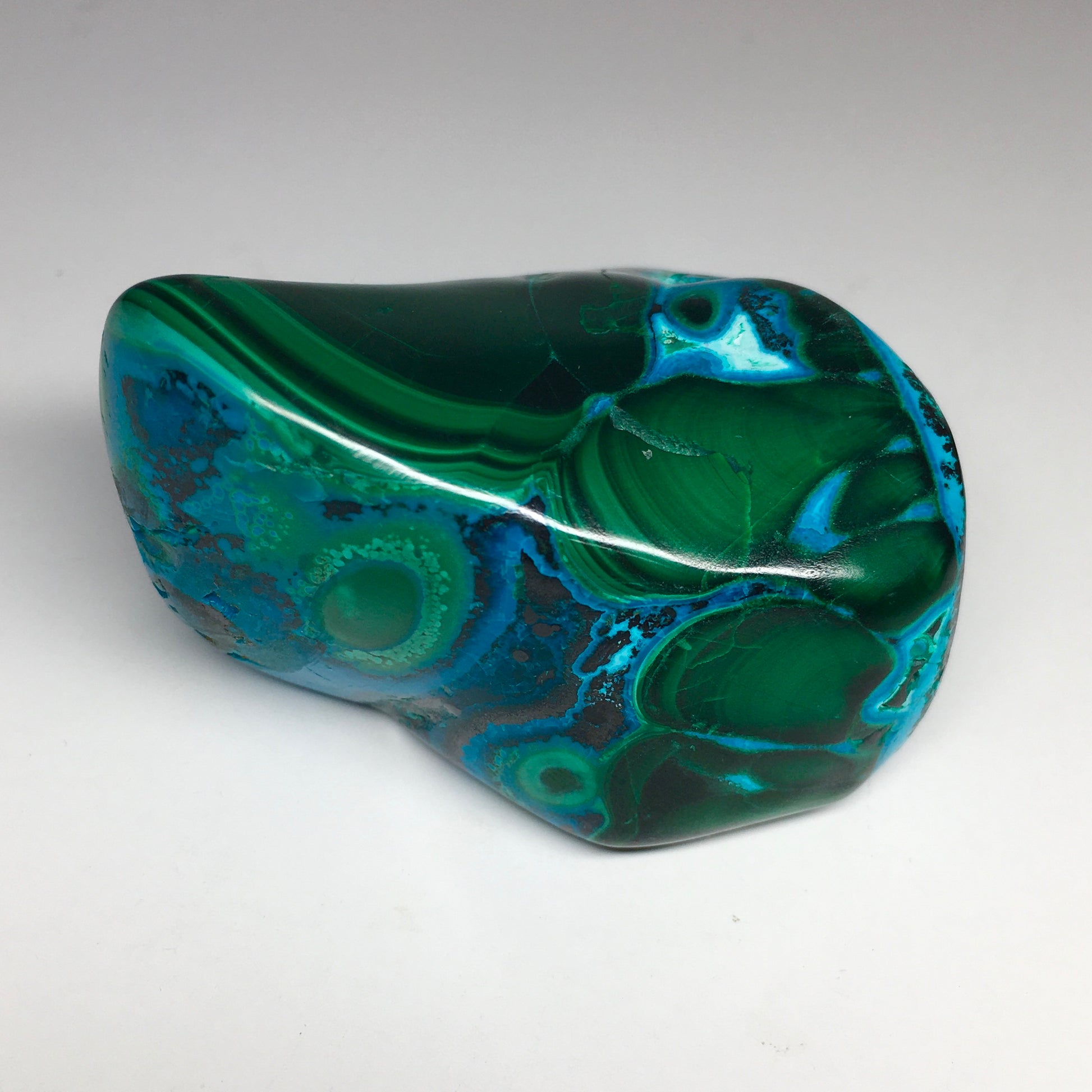 This stunning polished piece of malachite is an exquisite addition to any collection. The darker blues of the cornetite and robin's egg blue of the chrysocolla stand out amid the deep hues of green of the malachite. These colors and the smooth polish make for a specimen that displays nicely from all sides.