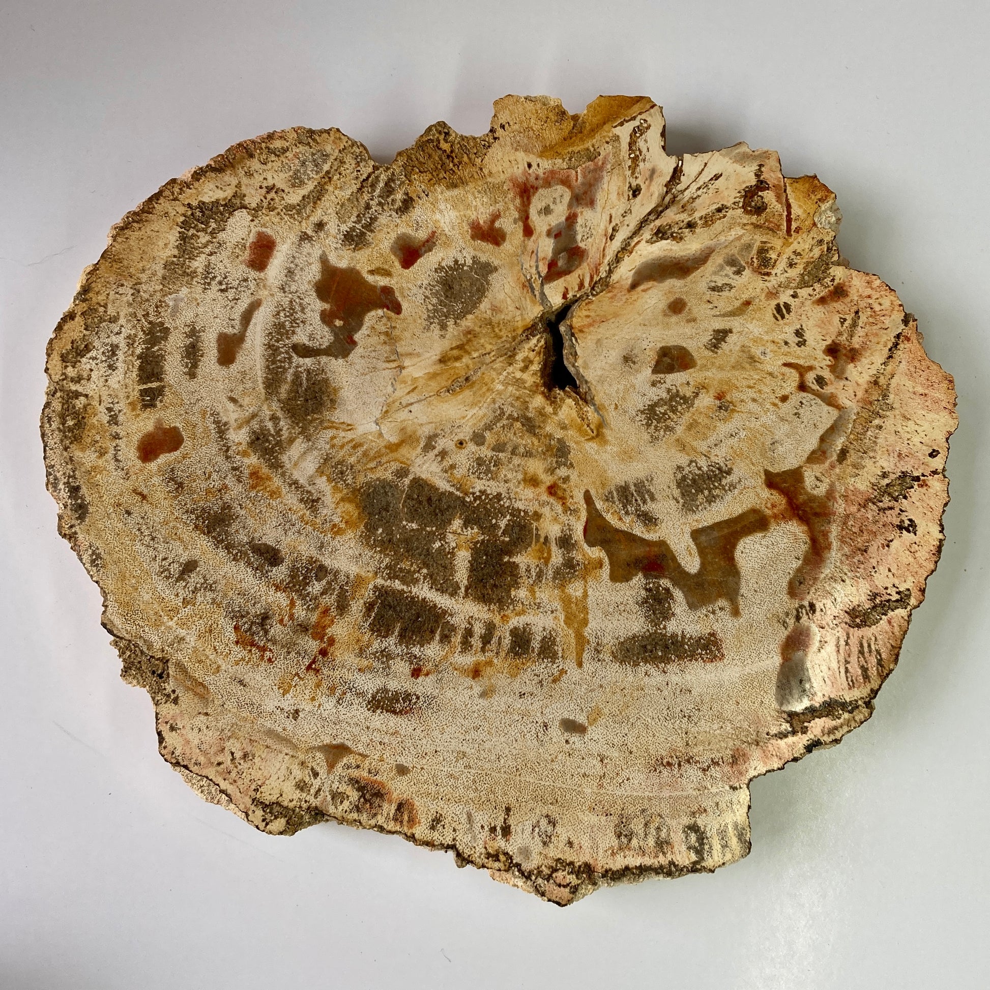In the late Tertiary period, blankets of rainforest surrounding volcanoes were plentiful throughout Indonesia. After a volcanic eruption these trees were buried by ash and lava eliminating any microbes that would rot the wood. The wood was replaced with silica-rich minerals like chalcedony, quartz, calcite, opal and jasper. The beautiful colors in the wood come from assorted trace elements; iron creates shades of brown and orange.