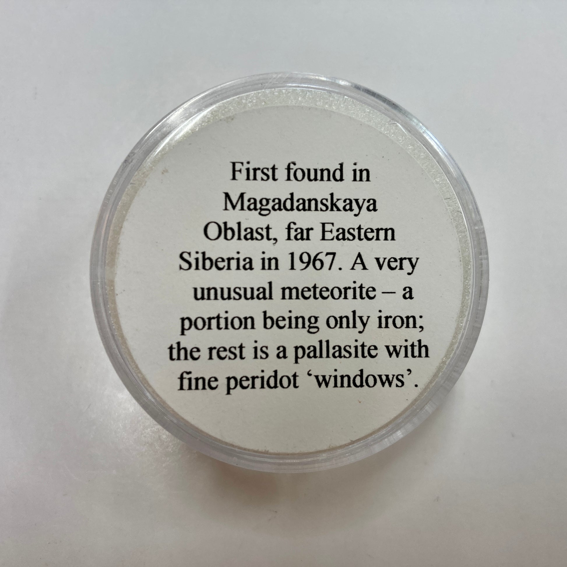 Seymchan is a rare pallasite meteorite that was first found in the dry bed of the Hekandue River in Magadanskaya Oblast, far Eastern Siberia in 1967.